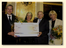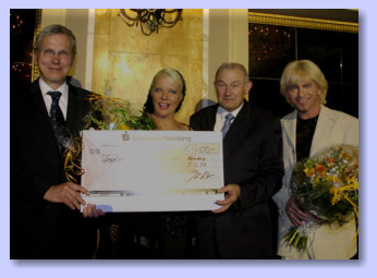 Ehrung durch Landrätin Dr. Gabriele PauliMit einem Sektempfang, Kaffee und Kuchen, einem 4-Gänge Menü und zahlreichen Ehrengästen feierte der fränkische Schlagerstar Mark Lorenz sein 20-jähriges Bühnenjubiläum im Europasaal vom Hotel Merkur. Rund 80 Gäste waren der Einladung gefolgt und freuten sich auf einen Tag mit ihrem Idol. Ehrengast war Fürths Landrätin Dr. Gabriele Pauli, die in ihrer Laudatio noch einmal 20 Jahre einer sehr beeindruckenden Karriere Revue passieren ließ. Mark lebt seit circa zwei Jahren in Oberasbach, hatte aber schon Jahre zuvor in zahlreichen Benefizaktionen Hilfsbedürftige im Landkreis, aber auch weit über dessen Grenzen hinaus, unterstützt. Ruth Renner von der Tierhilfe Franken hatte eine Tombola zu Gunsten armer Tiere organisiert und war glücklich darüber alle Lose verkaufen zu können. Ballettmeisterin Erni Koydl sorgt mit ihrem Kinderballett für gute Unterhaltung. Nach Kaffee und Kuchen betrat Mark Lorenz die Bühne. Mit seinen Hits und Evergreens sowie einer musikalischen Reise, (er sang in italienisch, schwedisch, englisch und französisch) begeisterte er wie immer sein Publikum