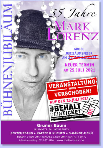 Zu seiner großen Jubiläumsfeier am 25.JULI 2021 begrüßt Sie Mark Lorenz